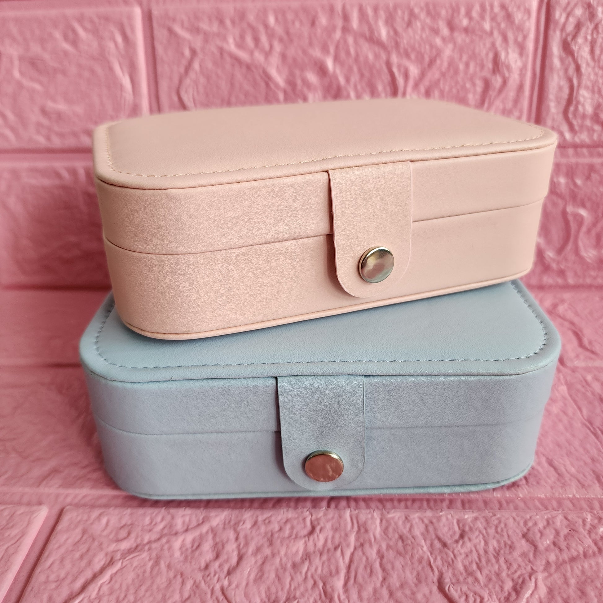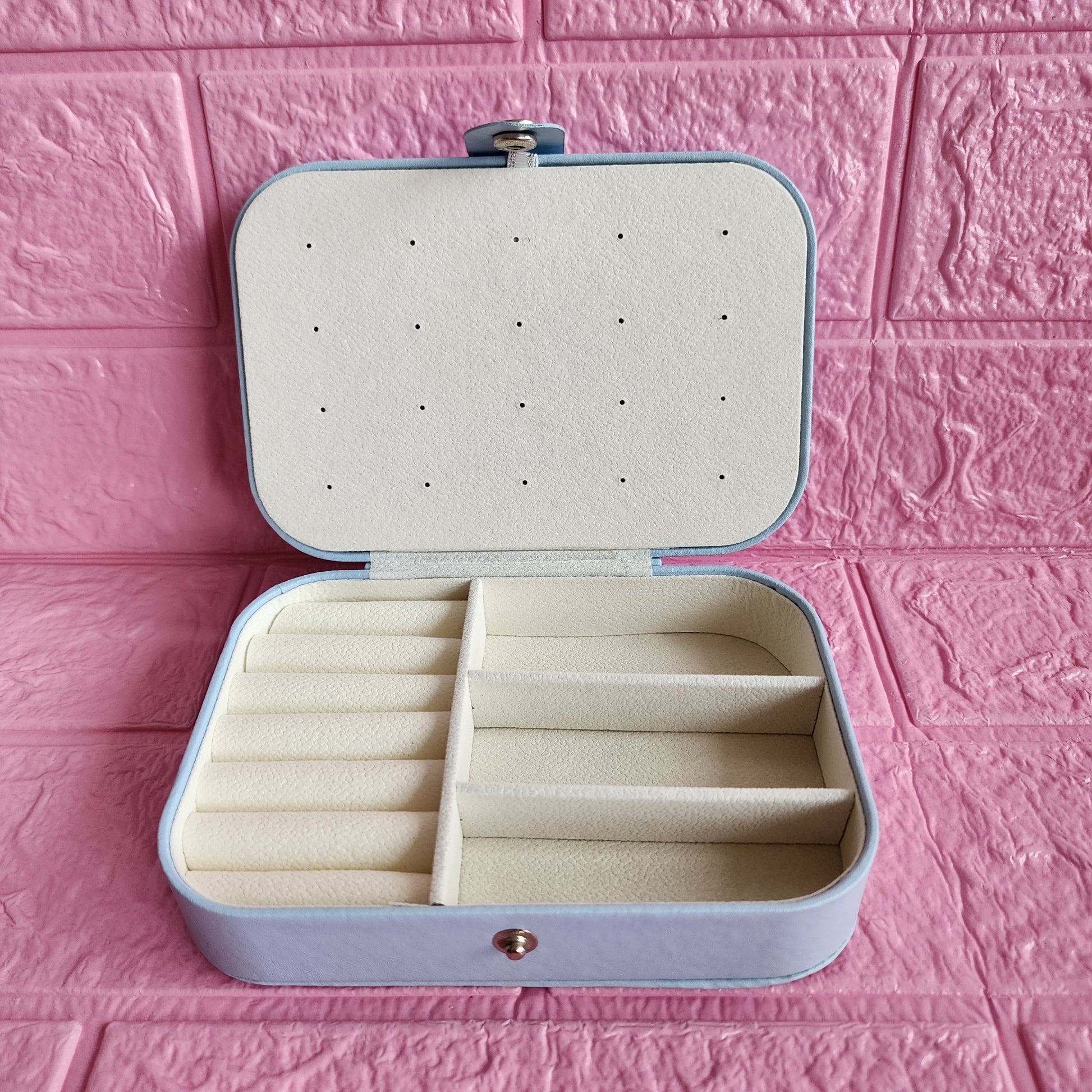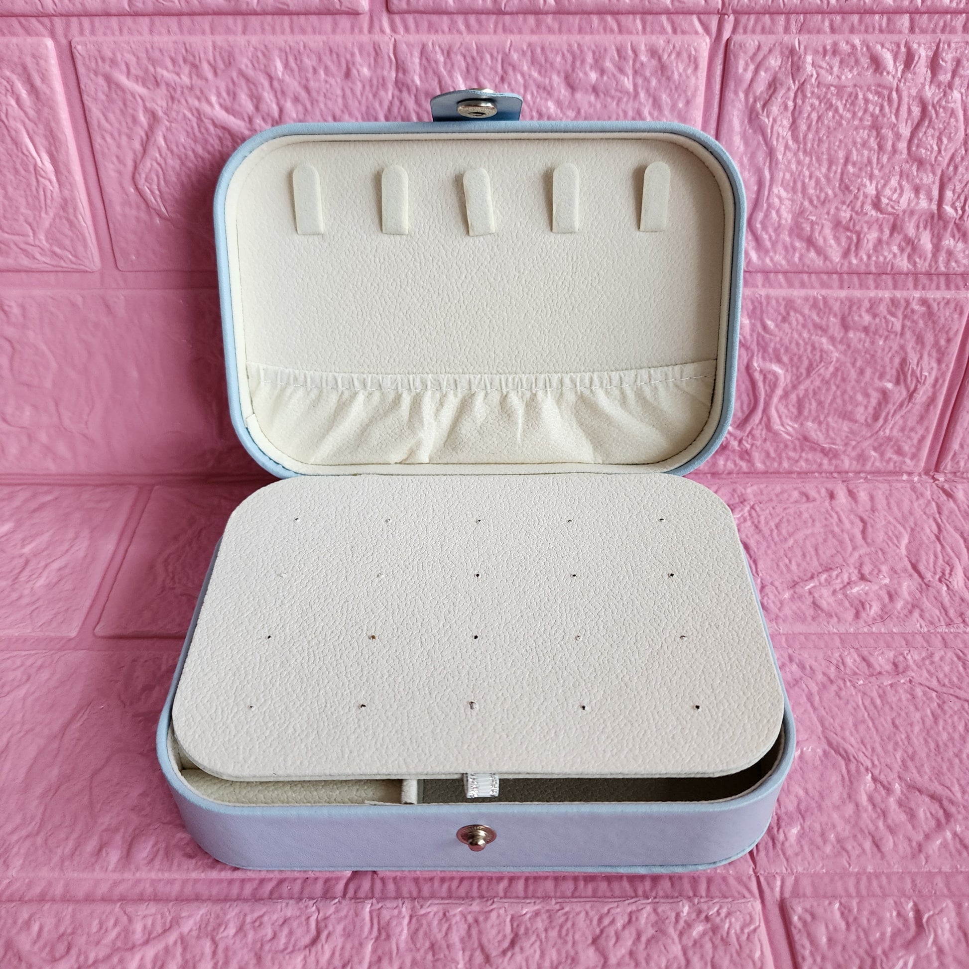 Joyero rectangular 16 x 11cm en cuerina con espacio para 10 pares de aretes pequeños, anillos, pulseras y espacio para 5 collares. Exterior en cuerina e interior afelpado